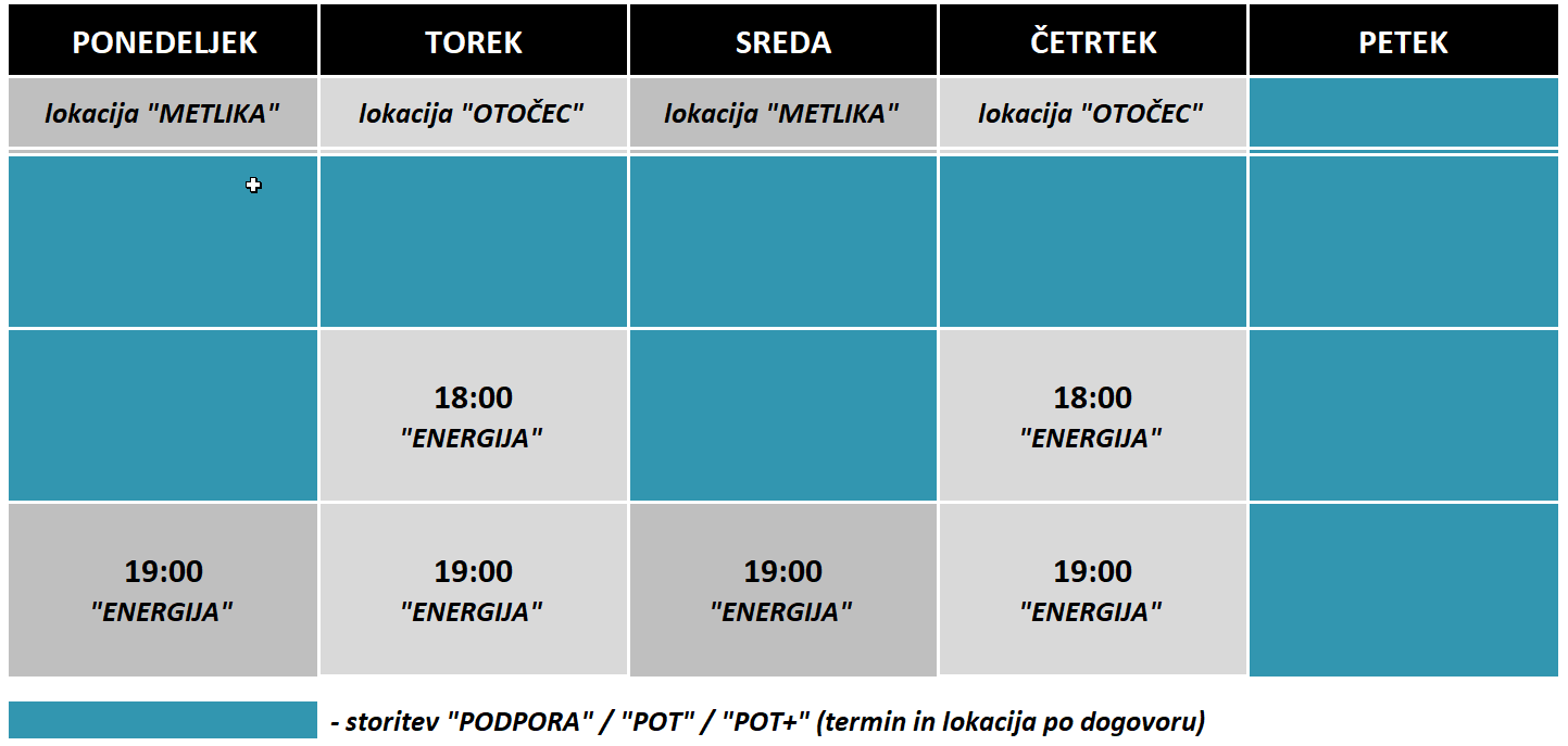 Storitev “PODPORA” / “POT” / “POT+” vsebuje vadbo po dogovoru.
